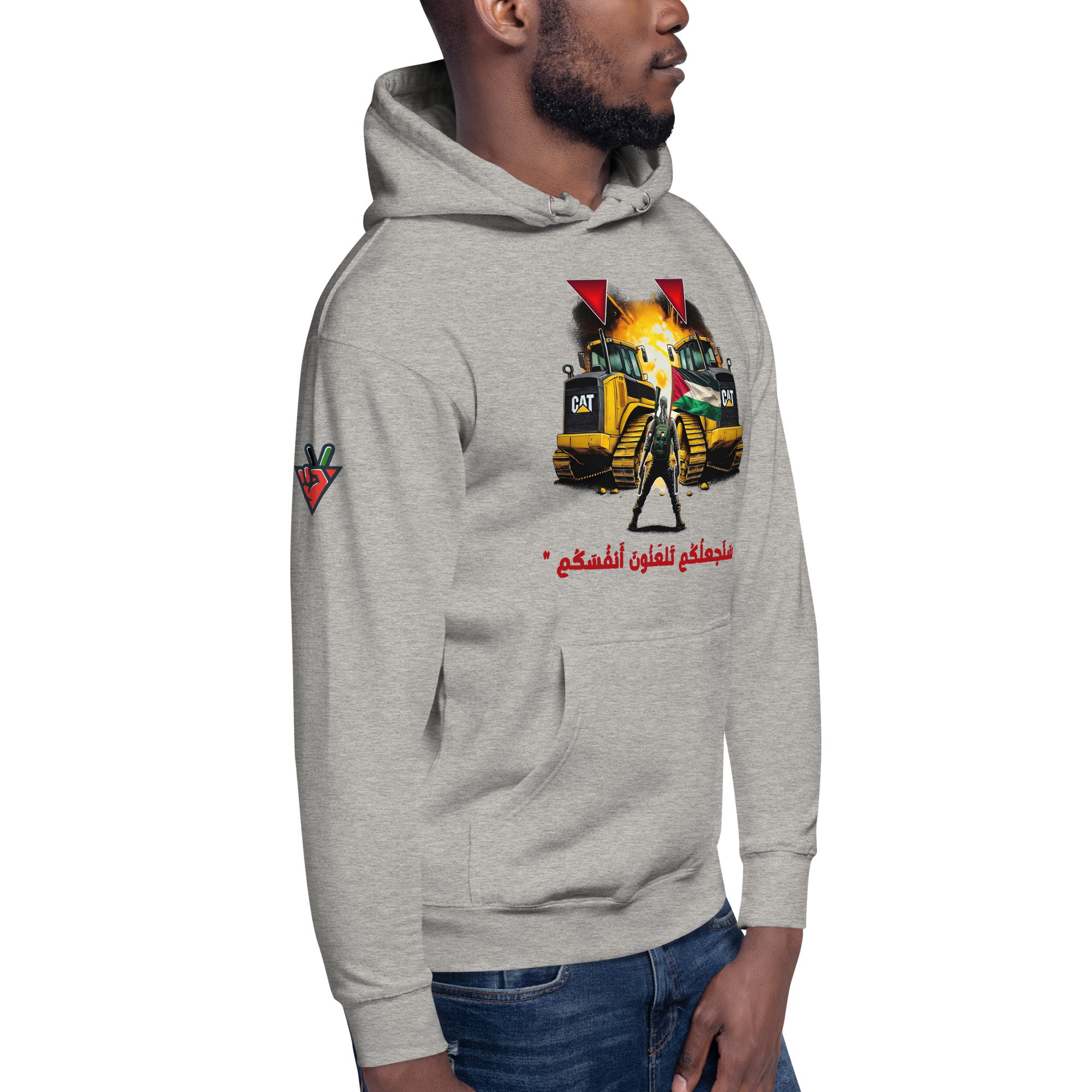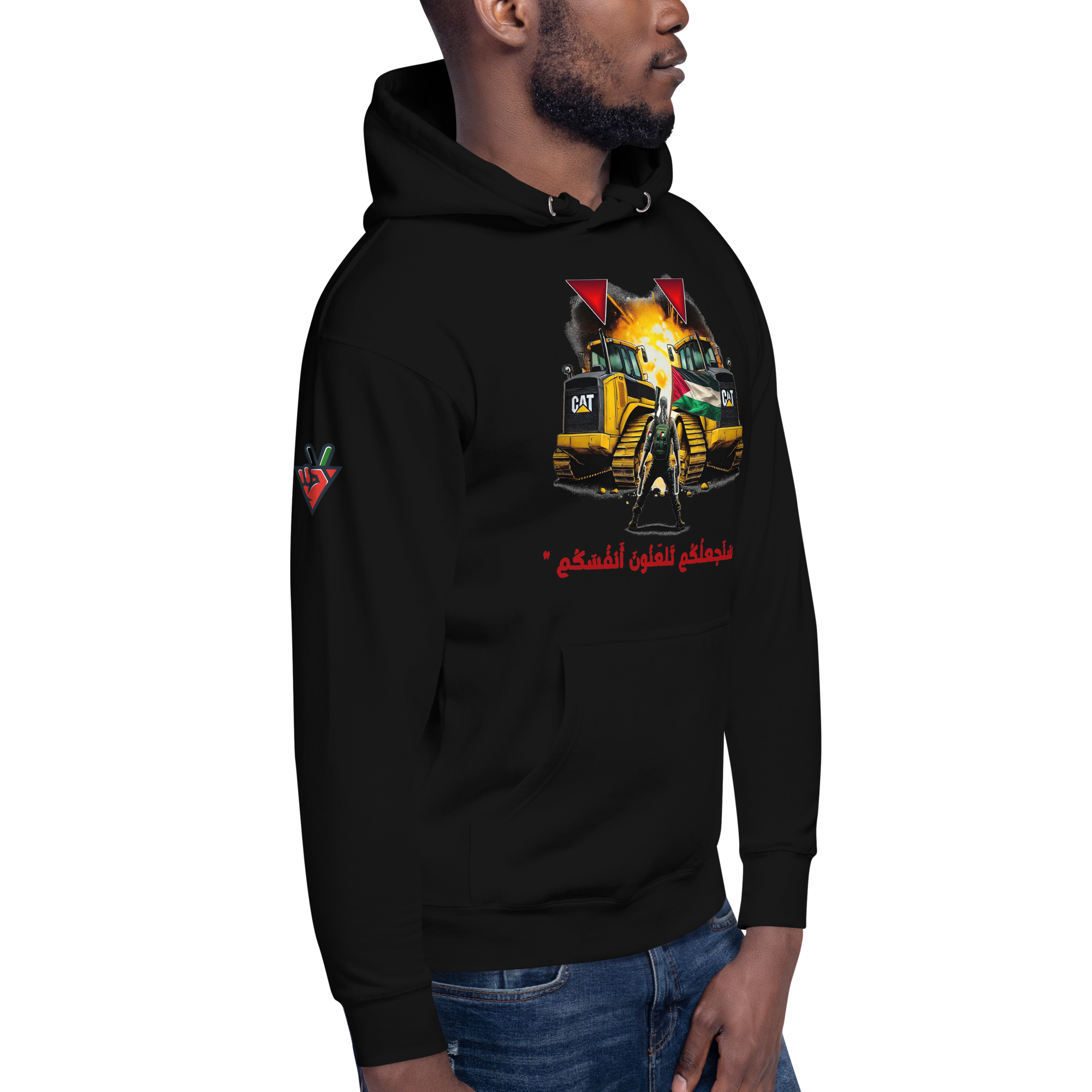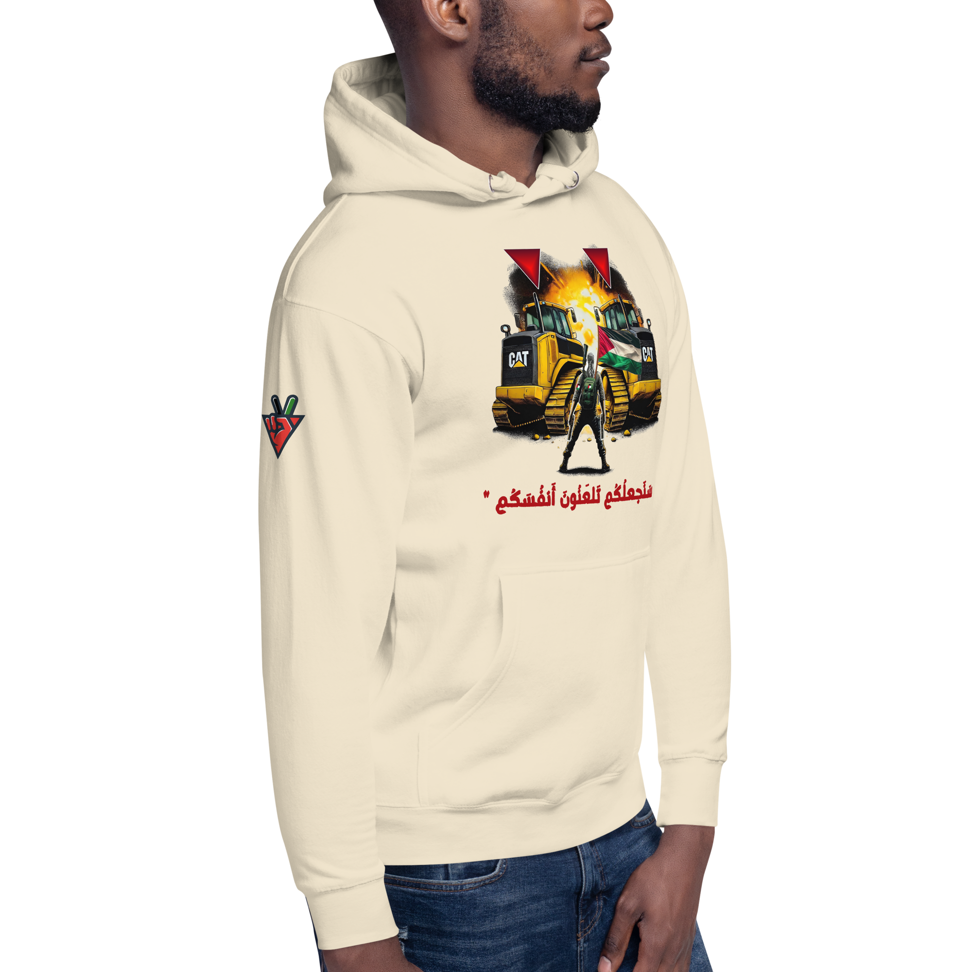 The daily life of a bulldozer destroyer. This design features a Palestinian fighter conquering two bulldozers. Be part of the resistance and wear this shirt inspired by this heroic act.