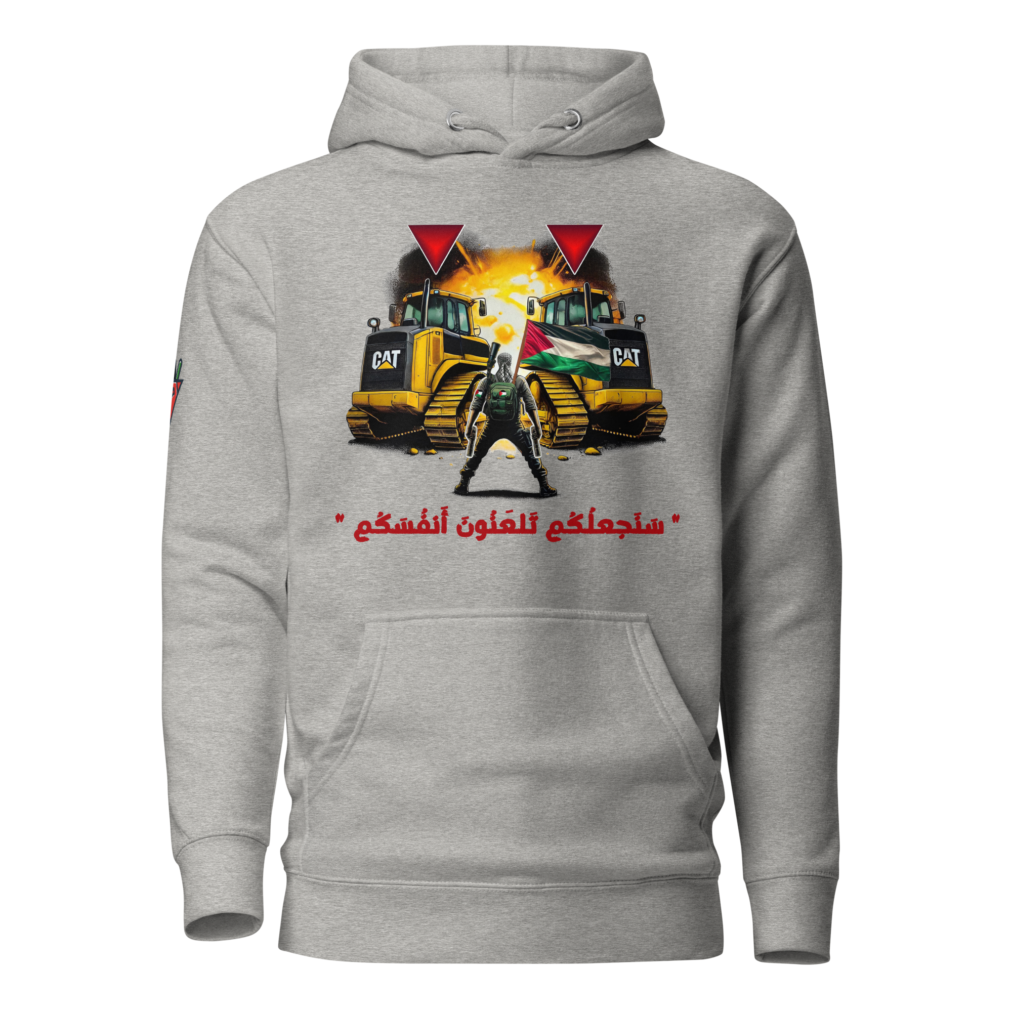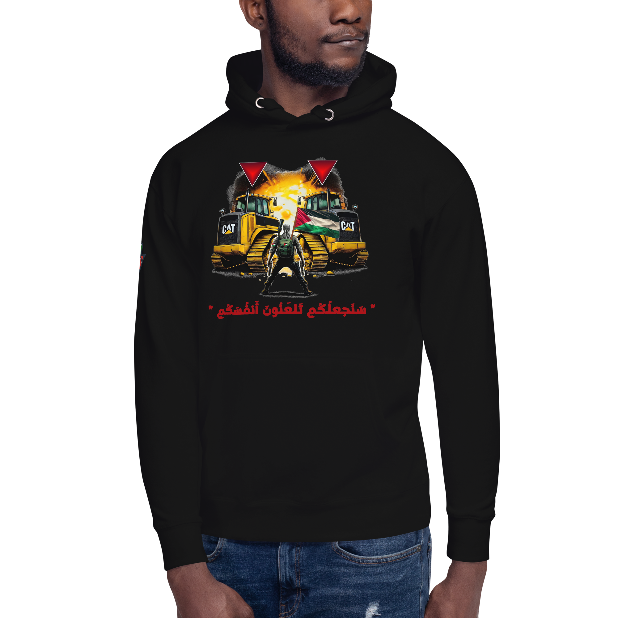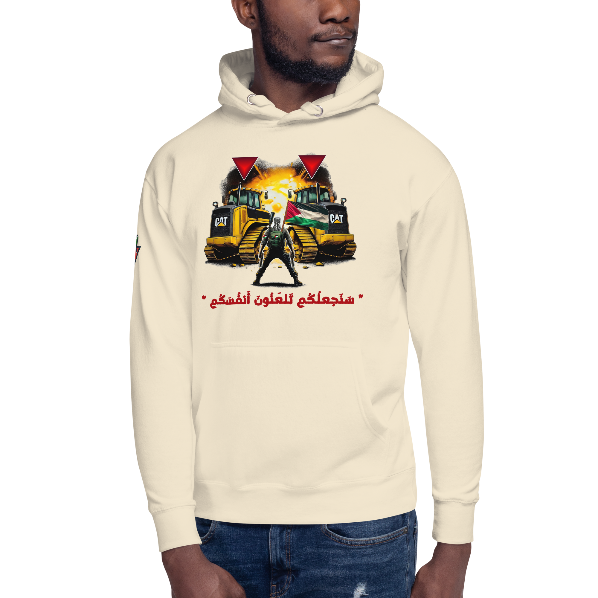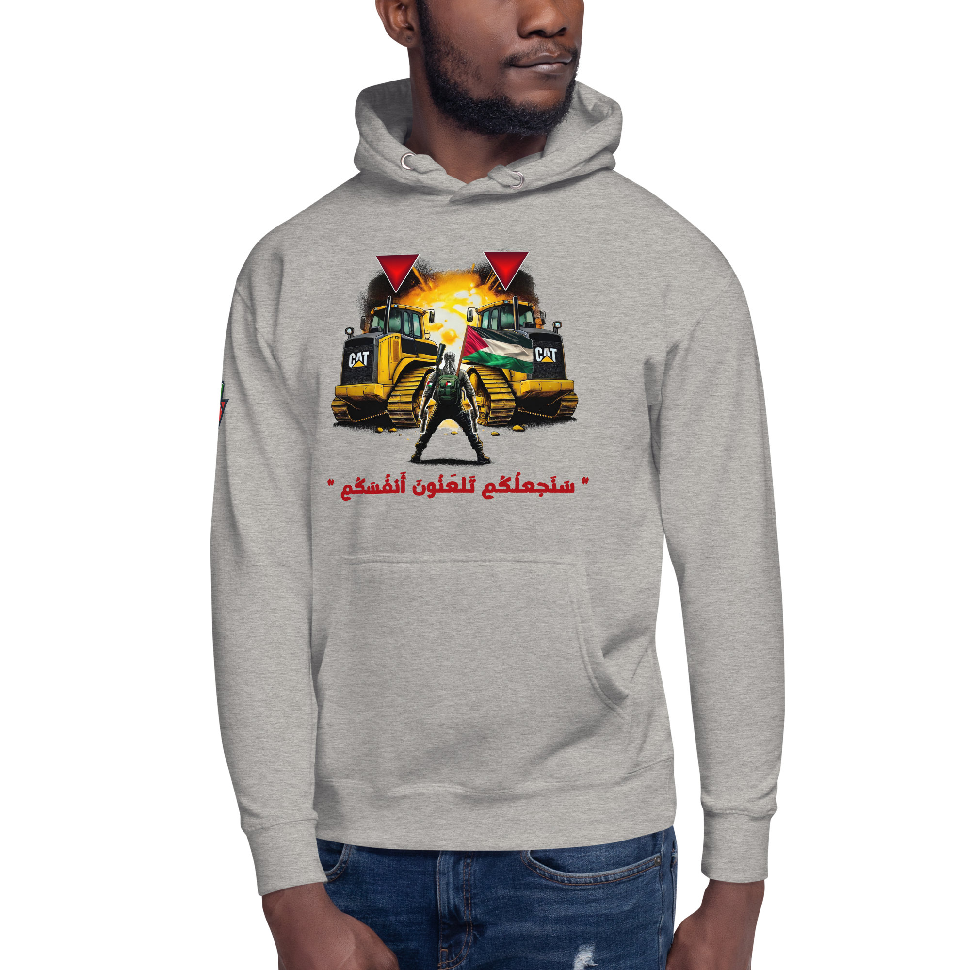 The daily life of a bulldozer destroyer. This design features a Palestinian fighter conquering two bulldozers. Be part of the resistance and wear this shirt inspired by this heroic act.