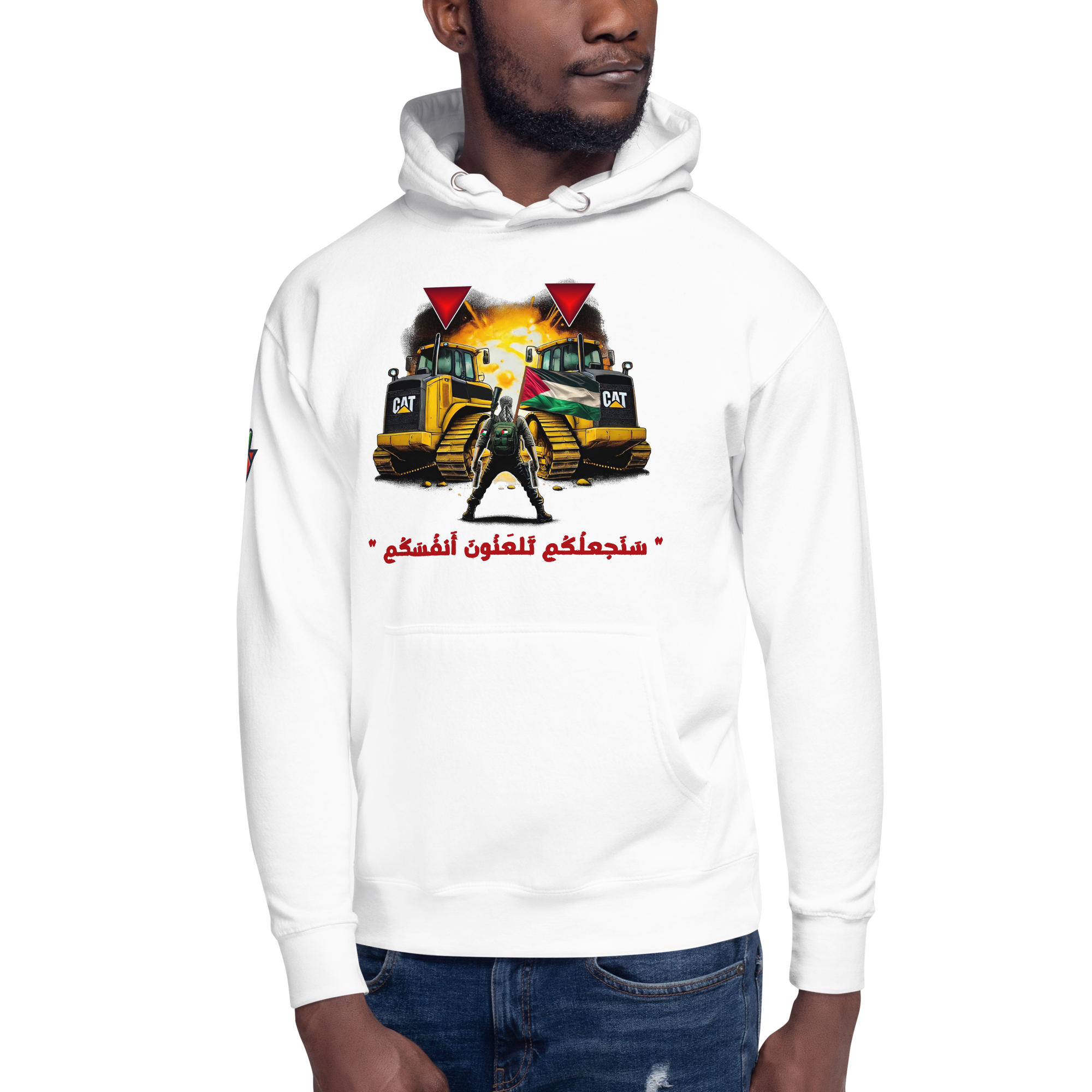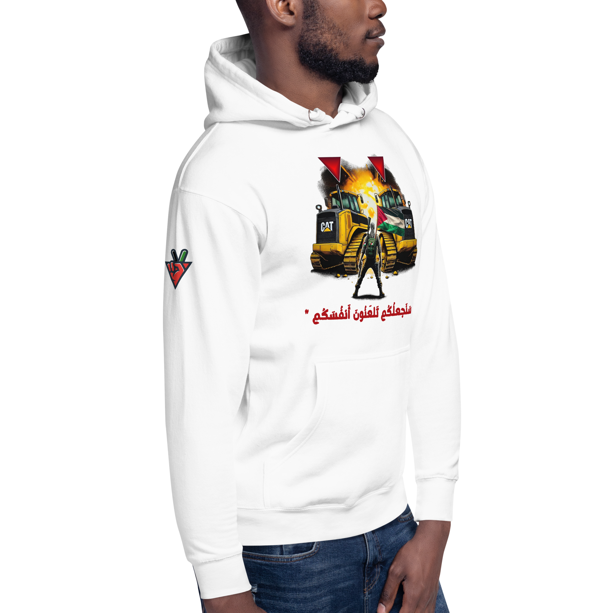 الحياة اليومية لمدمر الجرافات. هذا التصميم فيه مقاتلاً فلسطينيًا يدمر جرافتين. كن جزءًا من المقاومة وارتدِ هذا التصميم.