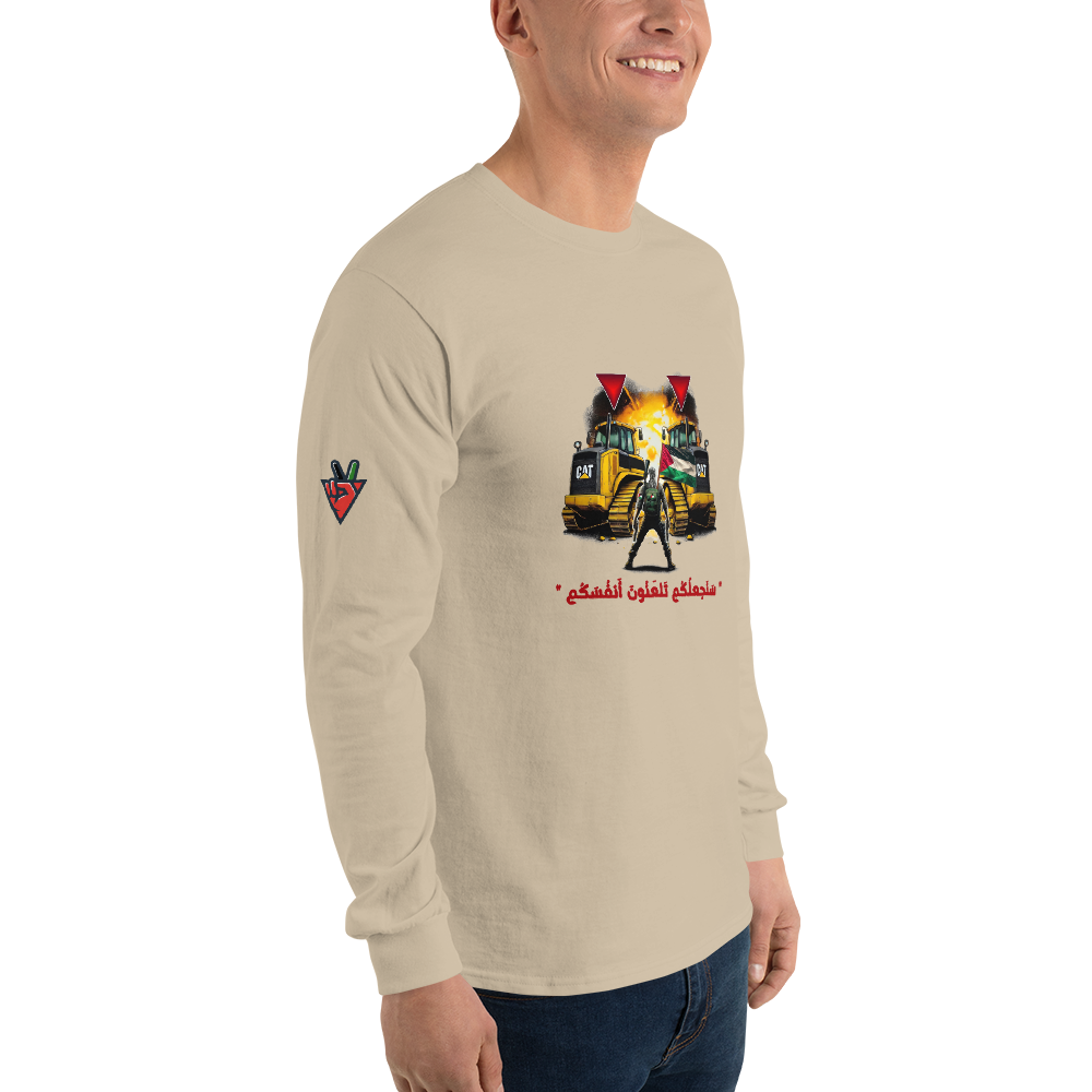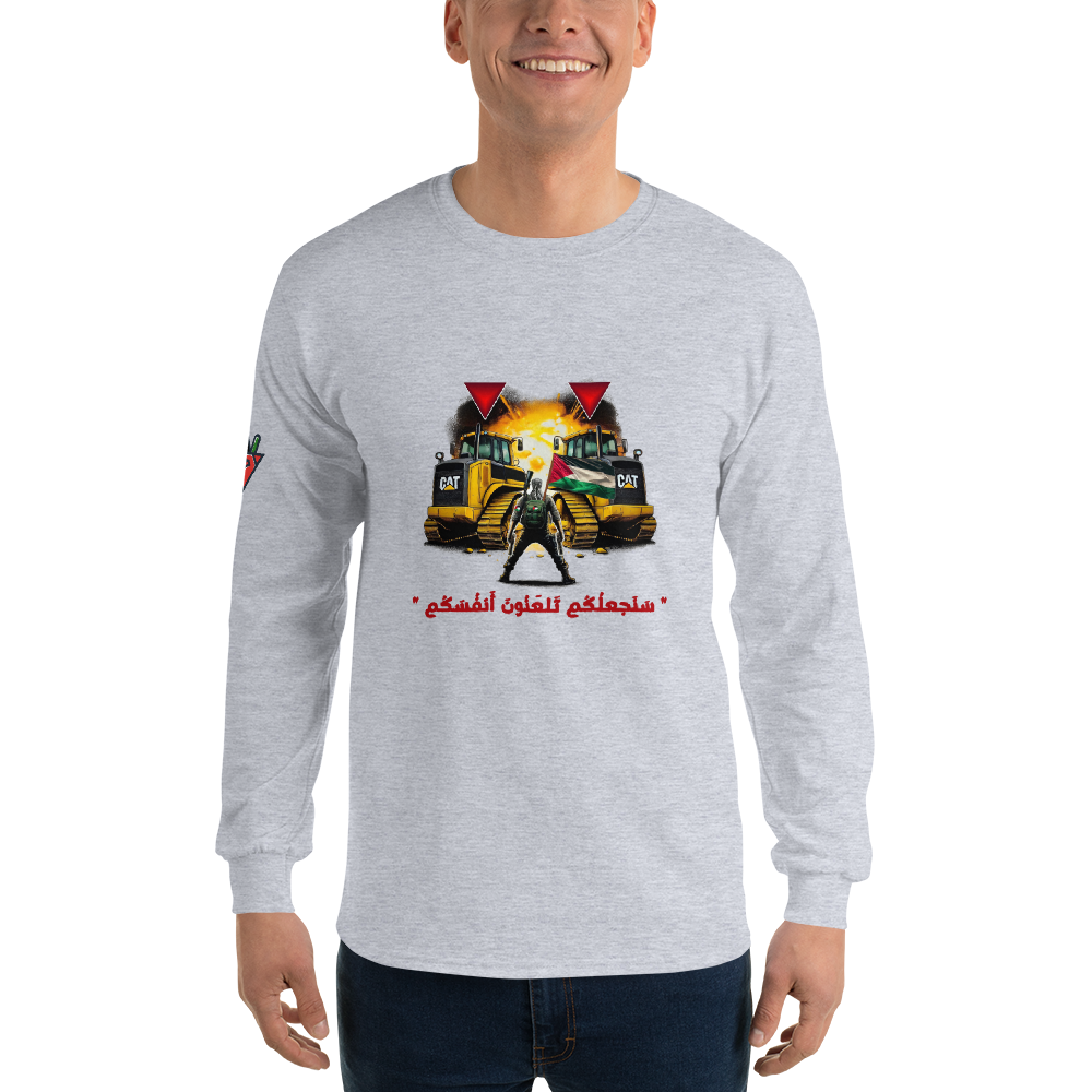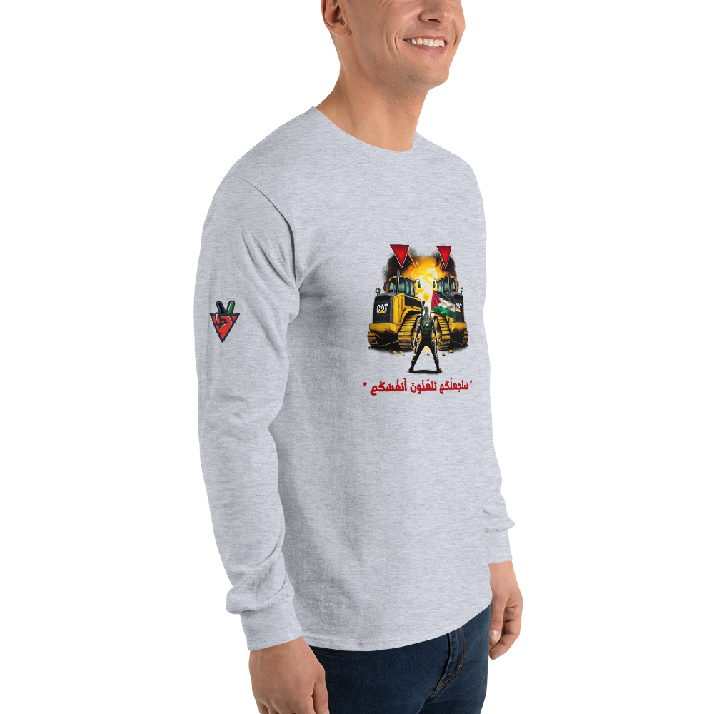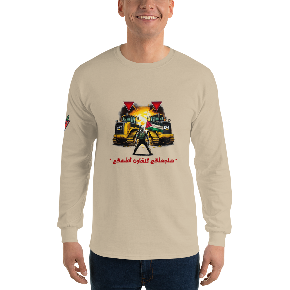 The daily life of a bulldozer destroyer. This design features a Palestinian fighter conquering two bulldozers. Be part of the resistance and wear this shirt inspired by this heroic act.