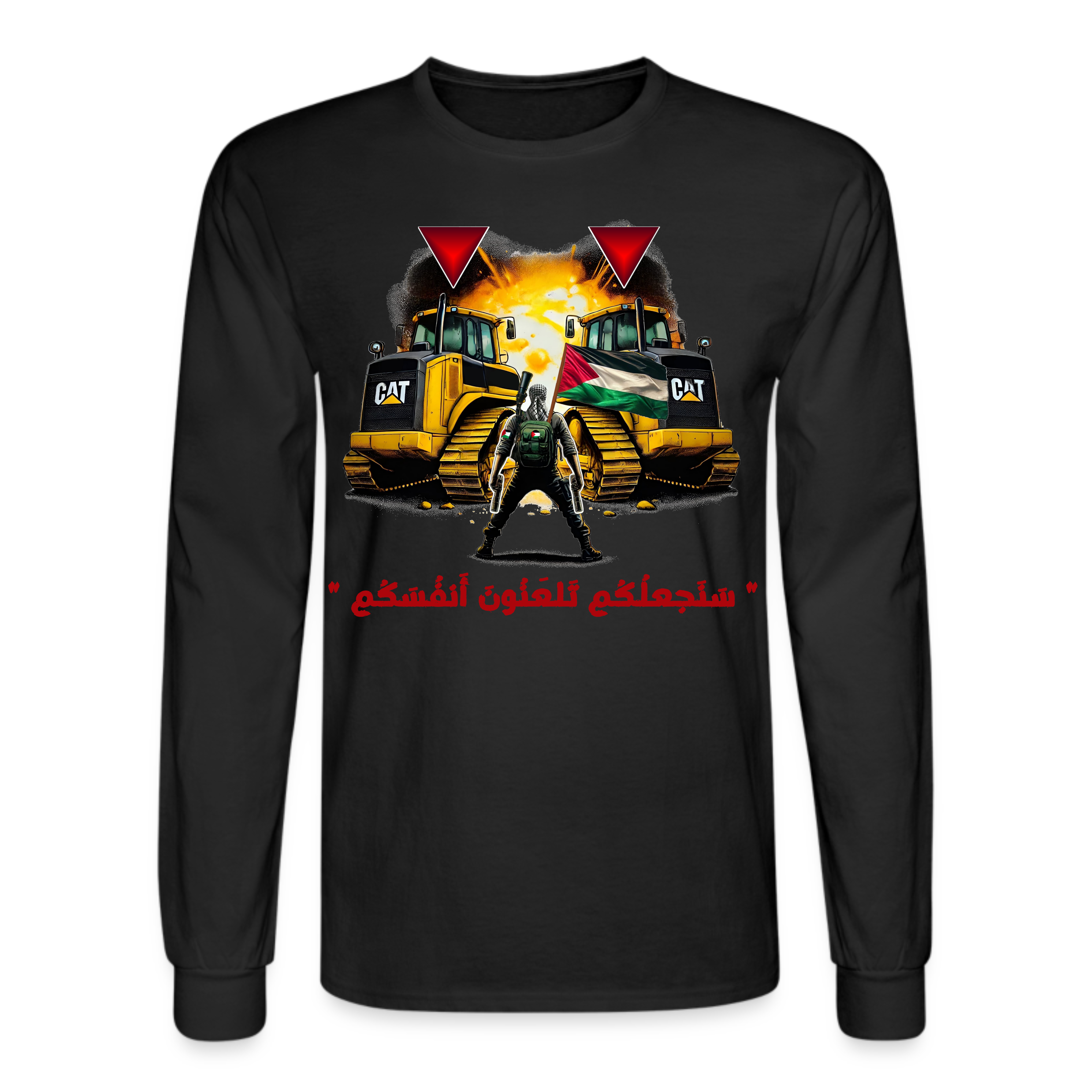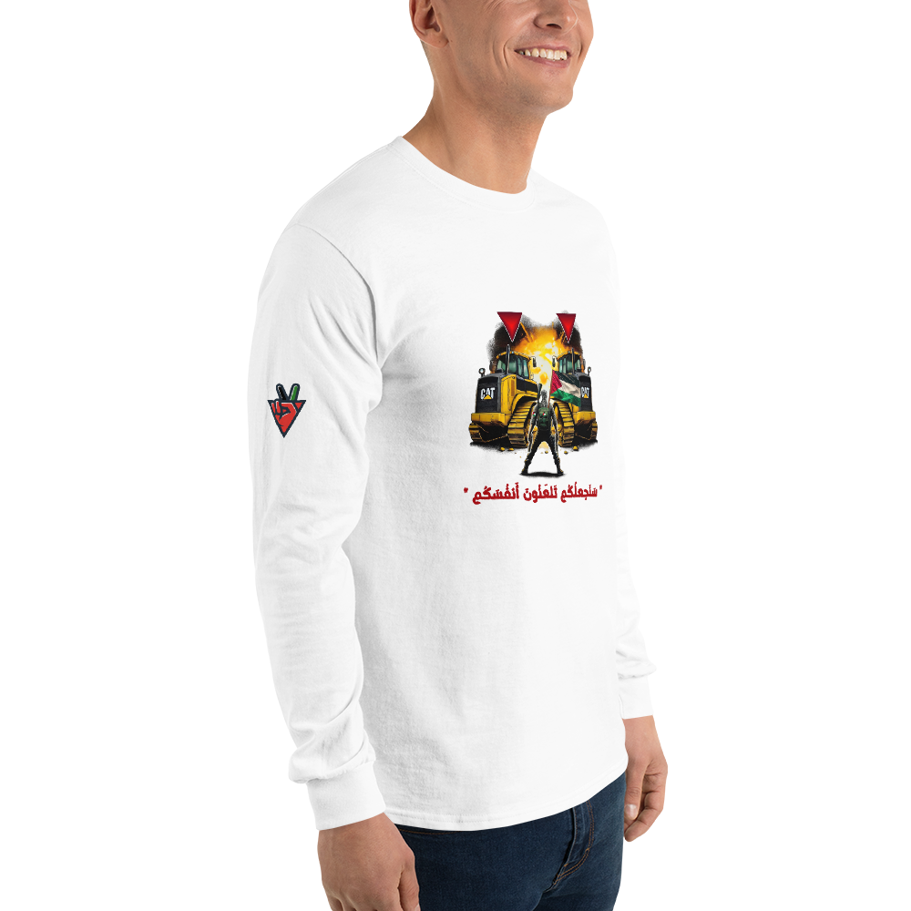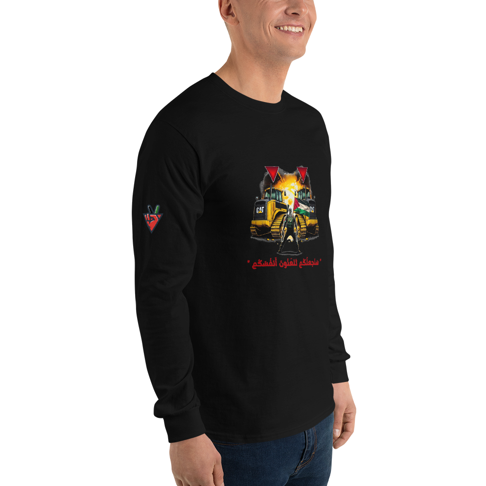 The daily life of a bulldozer destroyer. This design features a Palestinian fighter conquering two bulldozers. Be part of the resistance and wear this shirt inspired by this heroic act.