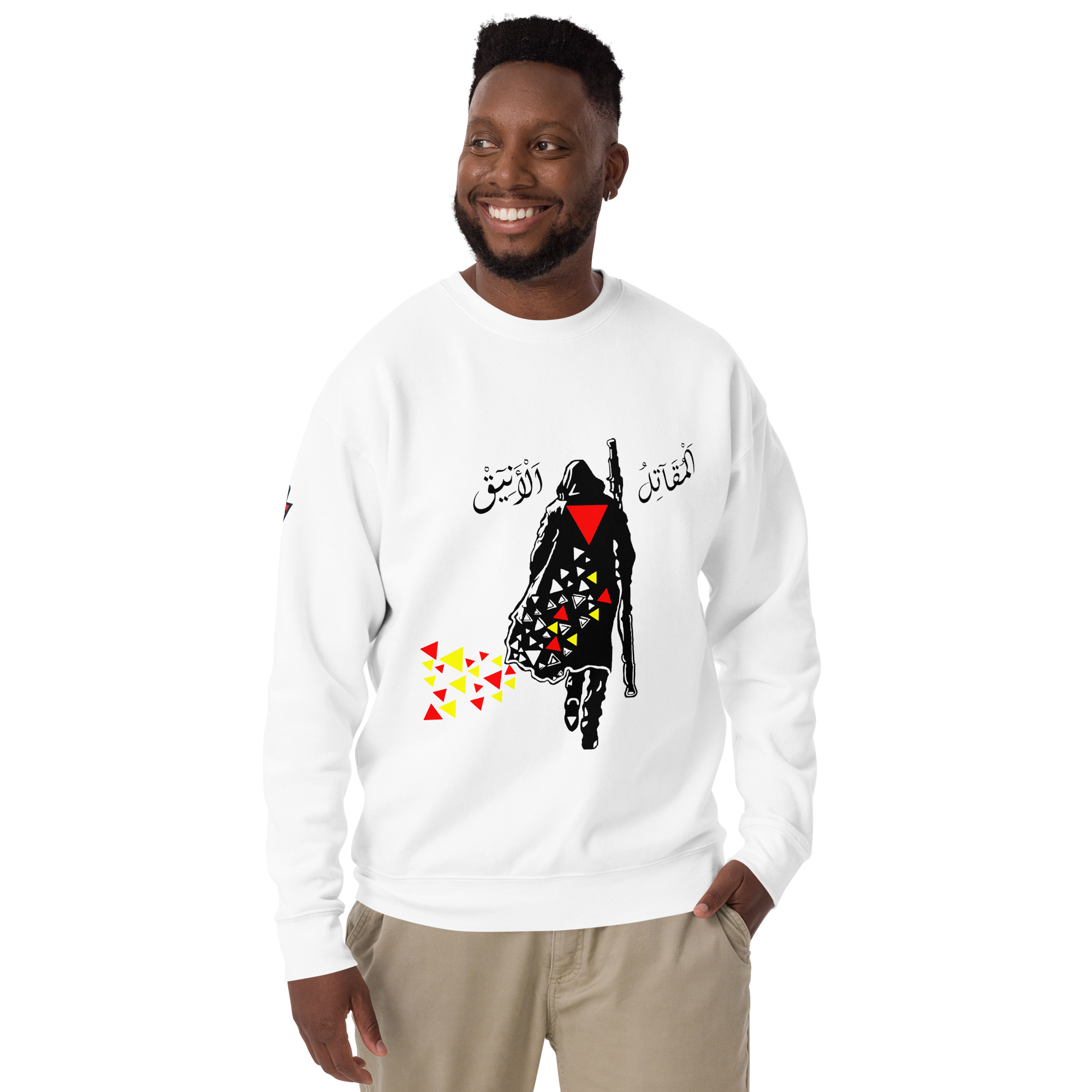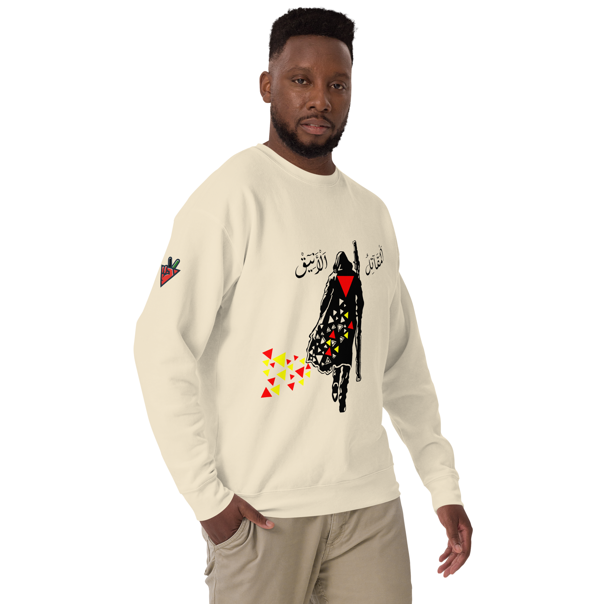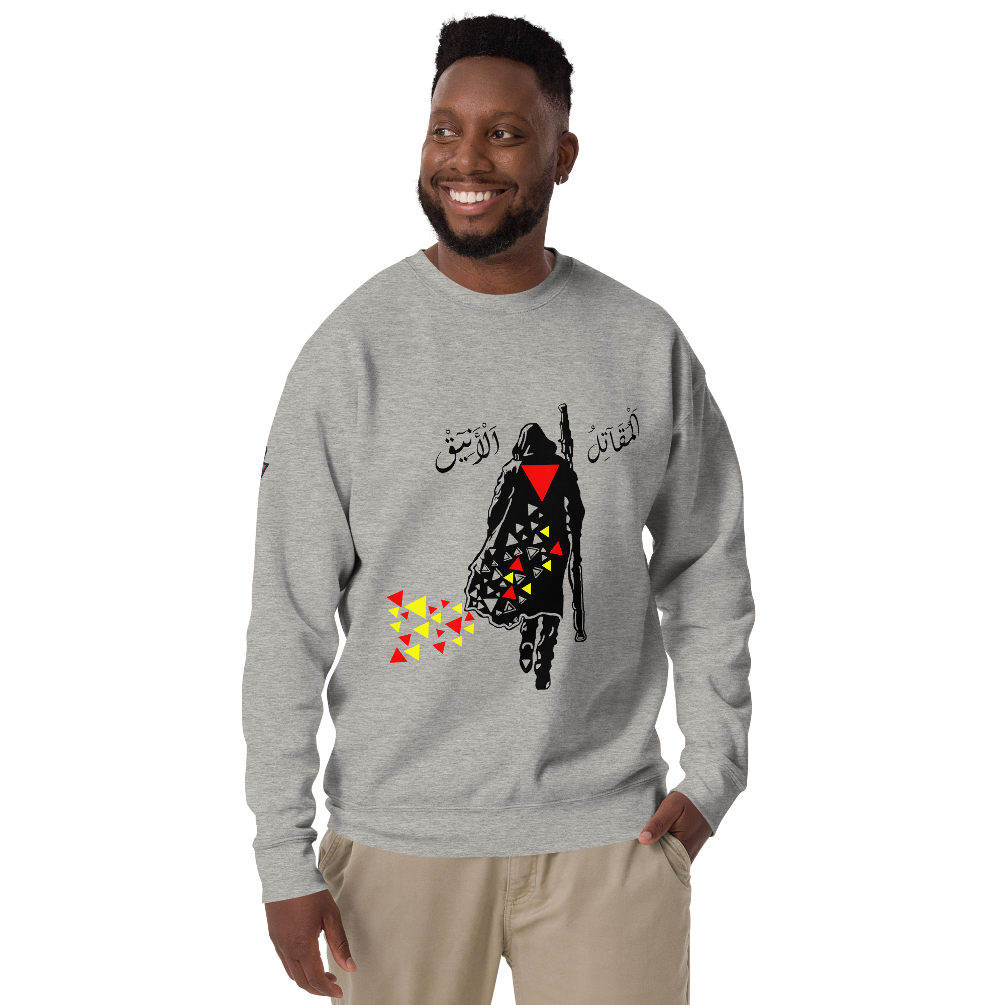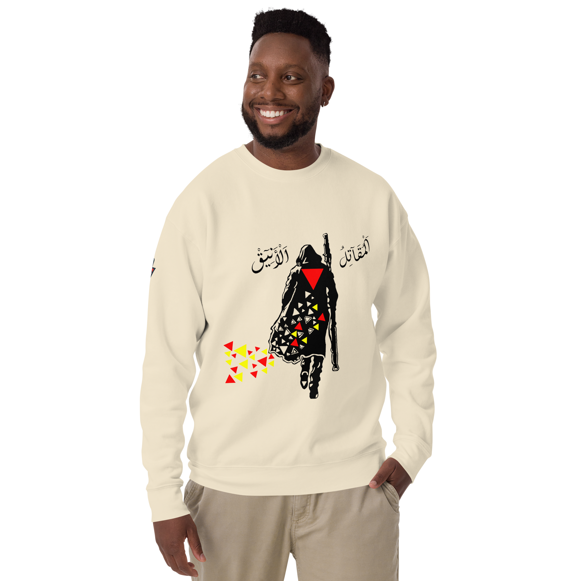 ?The Elegant Fighter Sweater ? We present to you our new sweater that embodies the Elegant Fighter, a symbol of Palestinian resistance and resilience with elegance. Get it now and be part of the resistance ? سويتر المقاتل الأنيق ? نقدم لكم سويترنا الجديد الذي يجسد المقاتل الأنيق، رمز المقاومة والصمود الفلسطيني بأناقة. احصلوا عليه الآن وكونوا جزءاً من المقاومة