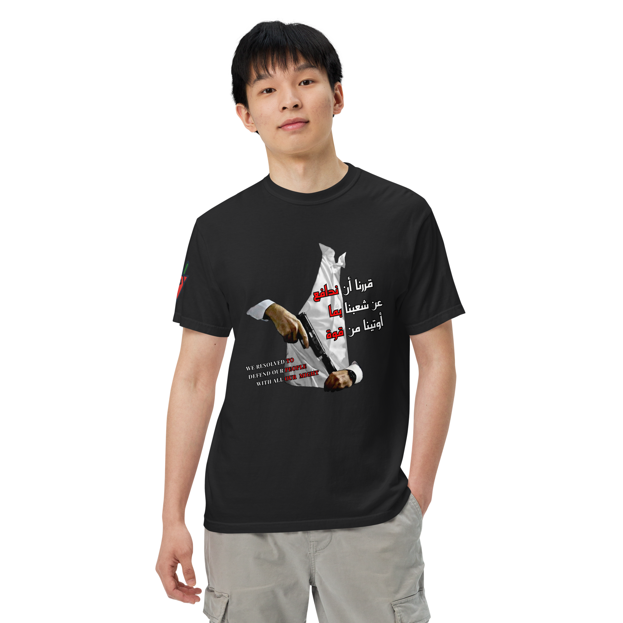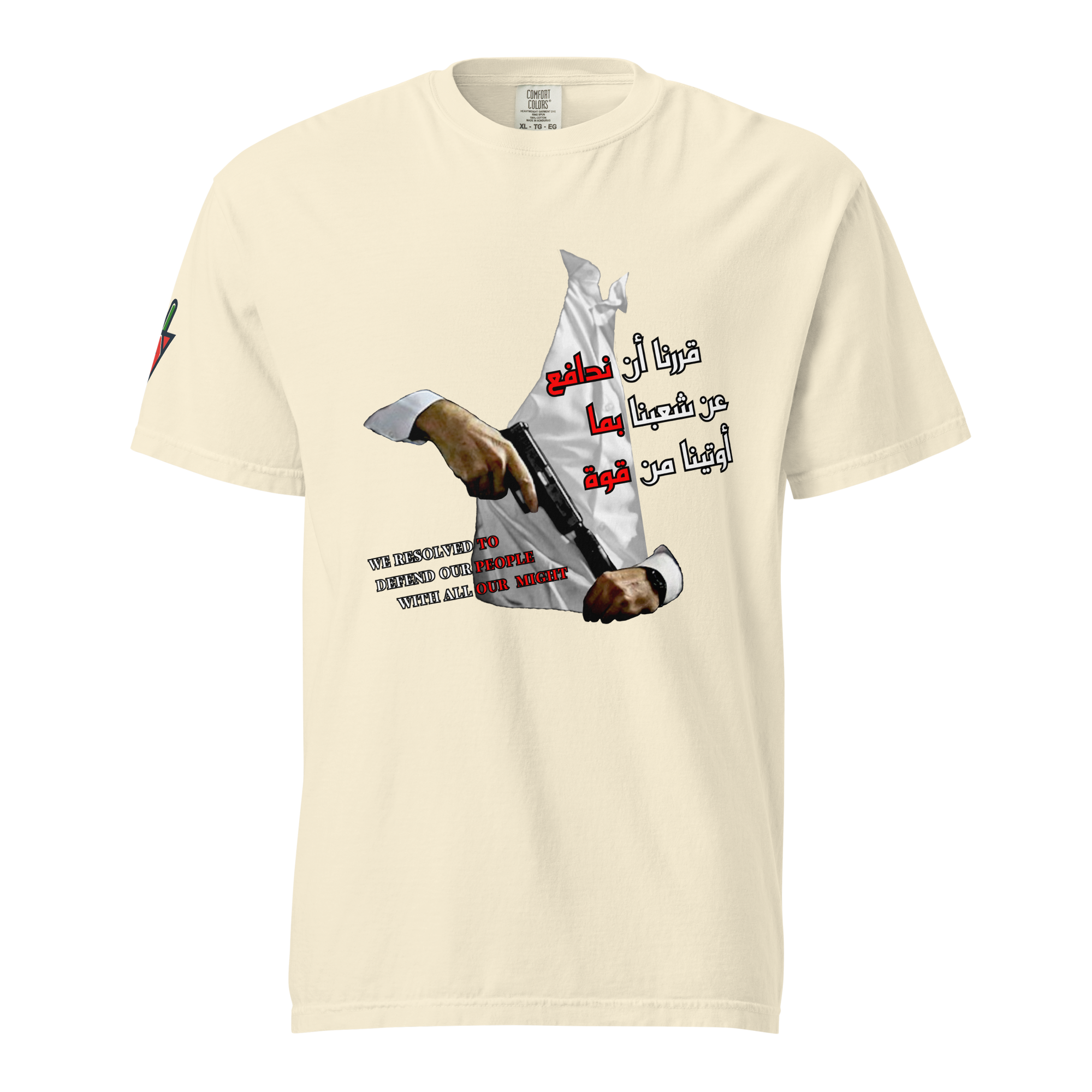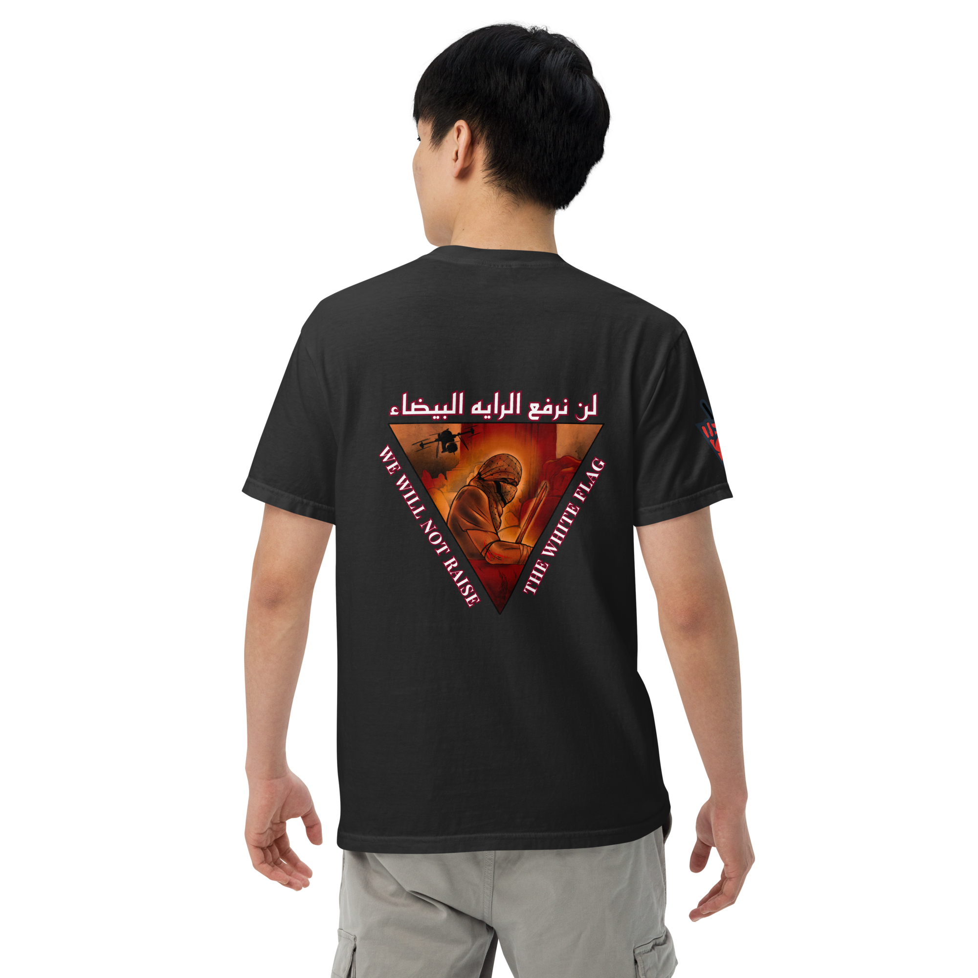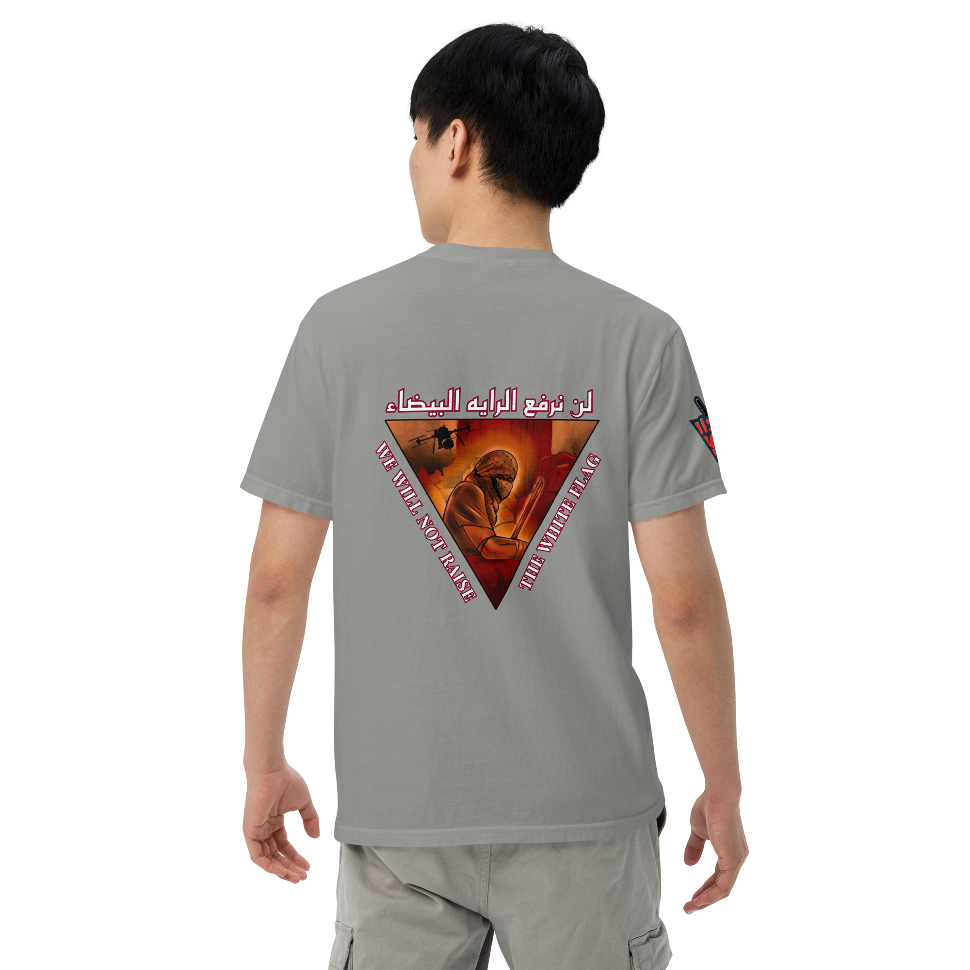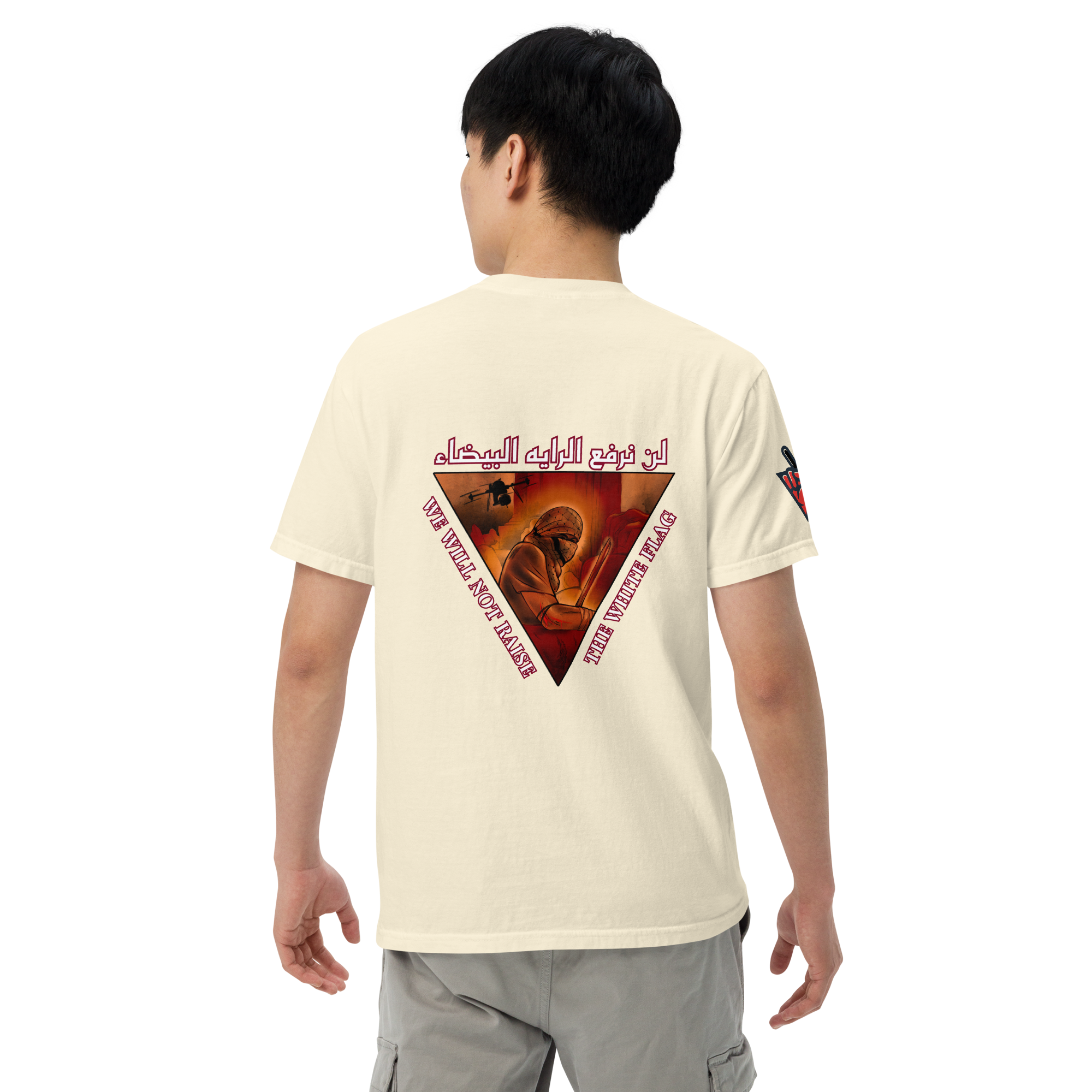 “We have resolved to defend our people with all our might.” These words, emblazoned on the front, embody a determination that lives beyond any one individual. The message continues on the back: “We will not raise the white flag,” a promise of resilience, a refusal to surrender.
